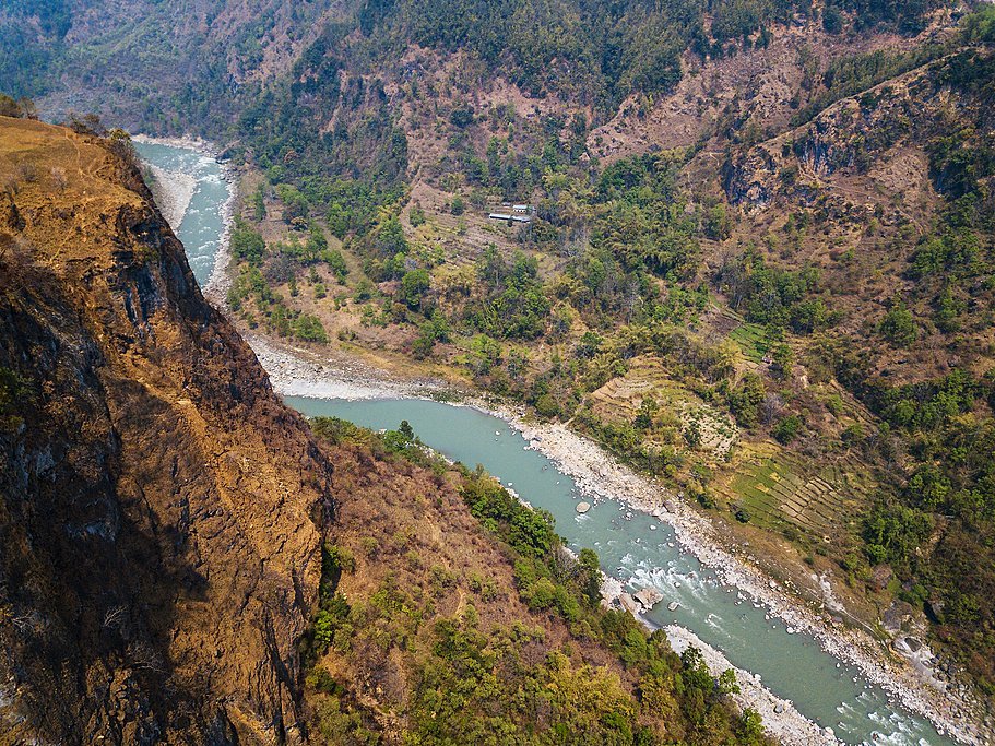 Bhote Koshi, translated as "river from Tibet," is the main branch of the Sun Koshi river and is famous for its thrilling white-water rafting opportunities in Nepal. This river originates near the Tibetan border at Kodari and is easily accessible, running parallel to the Arniko Highway from Kathmandu to Lhasa. Its upper valley, particularly above Barabise, is notably narrow with steep sides rising over 2,000 meters, descending into dramatic gorges at river level.